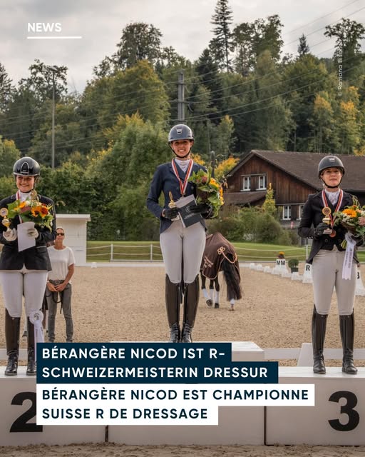 La finale du championnat suisse Dressage R s’est déroulée le 21 septembre dernier à Turbenthal (Reithalle Gmeiwerch). Au final, Bérangère Nicod s’impose brillamment avec Four Degrees après avoir remporté la deuxième manche. Tamara Roh (Firefly), longtemps en lice pour le podium après une 1re manche partagée en 2e place ex aequo avec Bérangère, termine 4e. Lorène Schneider (Romane des Prés) signe une belle 6e place pour sa première finale.